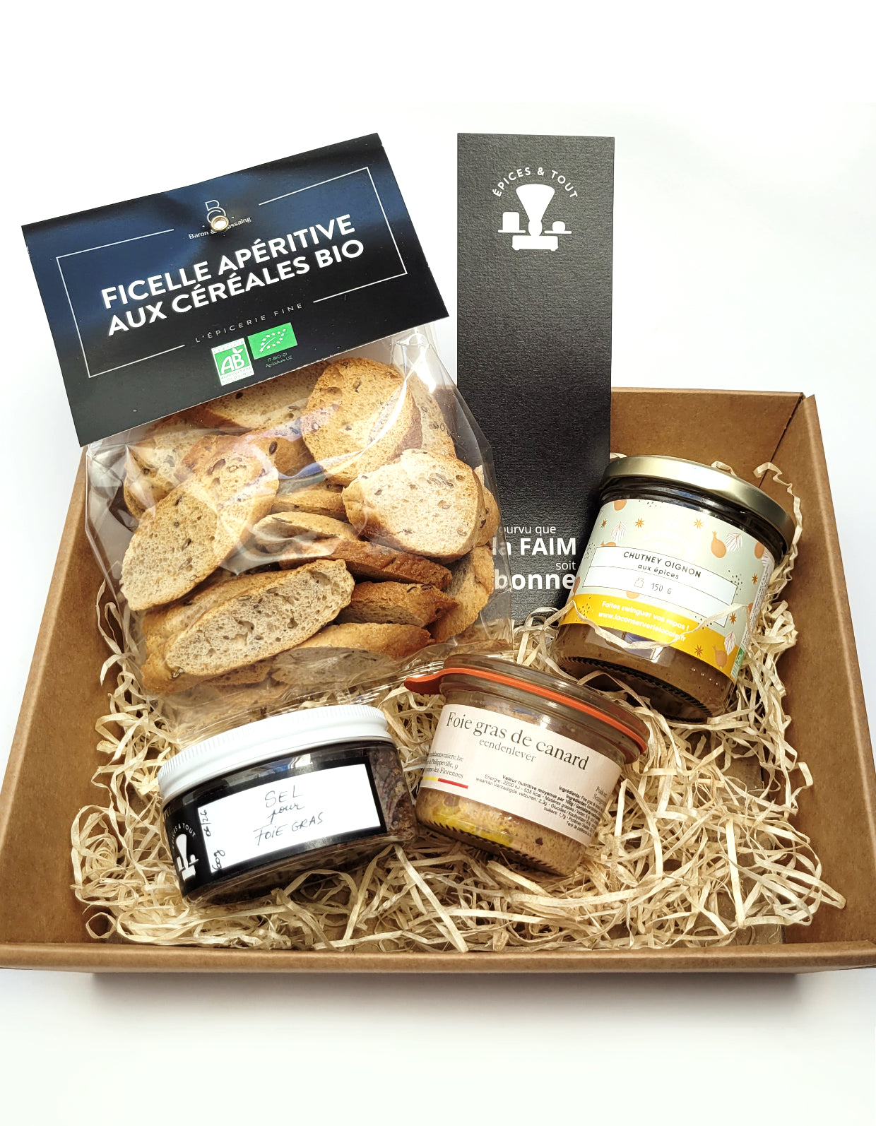🦆 Un foie gras de canard artisanal de la ferme de la Sauvenière, fondant et savoureux.🍞 Des ficelles apéritives bio croustillantes, parfaites pour accompagner tartinades et foie gras.